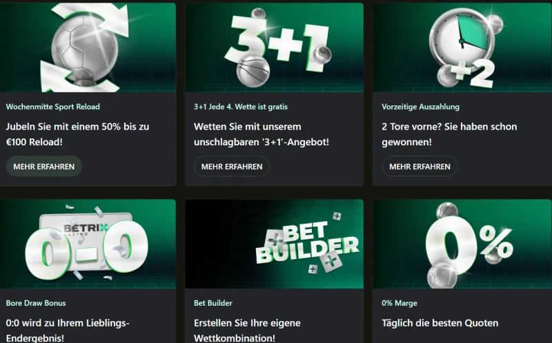 Sportaktionen im Casino Betrix laufen eigenständig, was die Nutzung erleichtert. Sie finden Reload-Boni passend zu spielintensiven Zeiten sowie Features, die über eine einfache Einzahlungsanpassung hinausgehen. Man kann es als zwei Ebenen sehen: Promo-Wert (Reloads) und Wettwert (Tools und Mechaniken).