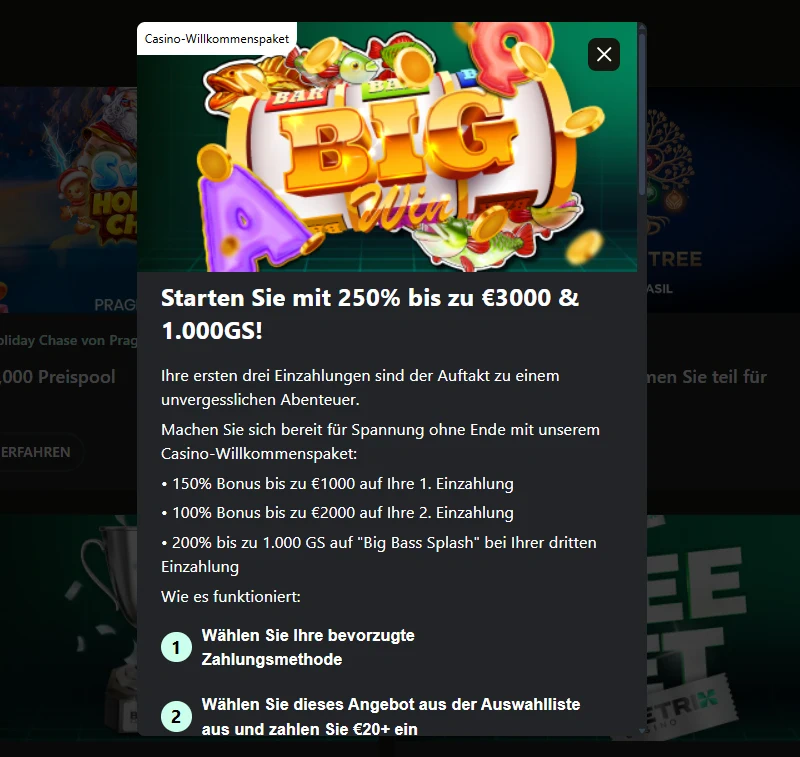 Das Betrix Haupt-Willkommensangebot ist ein dreistufiges Paket, das Schwung aufbaut. Über Ihre ersten Einzahlungen können Sie bis zu 250% bis zu 3.000 € und 1.000 Freispiele freischalten, wobei jede Stufe einen anderen Wert bietet. Die Struktur ist ideal, wenn Sie Ihr Bankroll-Management mögen – zuerst starke Bonusgelder, dann eine große Menge Freispiele als Abschlussbelohnung.