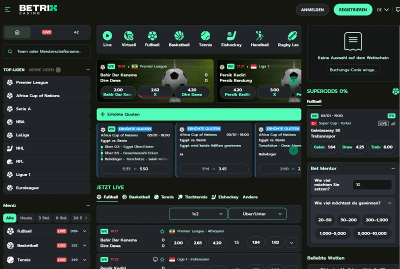 Neben Casino-Inhalten bietet Betrix auch ein umfassendes Sportwetten-Erlebnis, das sich integriert anfühlt und nicht wie „aufgesetzt“. Deutsche Nutzer können klare Sport-Tabs durchsuchen (wie Fußball, Basketball, Tennis, Eishockey und mehr), wobei Ligen für eine schnelle Navigation organisiert sind, unterstützt durch Tools wie Highlights für erhöhte Quoten und ein Widget im Stil eines Wett-Mentors zur Entscheidungsfindung.